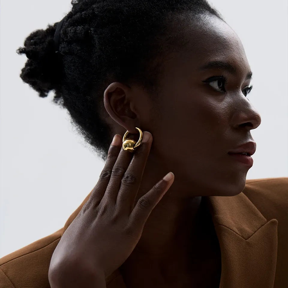 Elevate your everyday elegance with these sophisticated hoop earrings, crafted from premium 316L stainless steel and finished with 18K gold PVD plating. The lustrous round ball design delivers timeless appeal, while the waterproof construction ensures durability through daily wear and various environments. Perfect for those seeking jewellery that combines refined aesthetics with practical longevity, these versatile pieces transition seamlessly from casual to formal occasions. The hypoallergenic stainless steel base makes them an excellent choice for sensitive skin, whilst the gold plating maintains its radiant finish season after season.