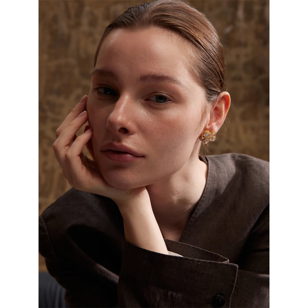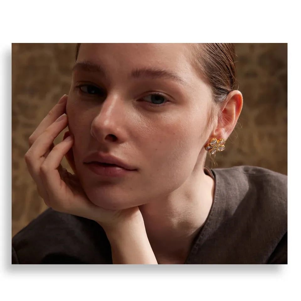 Elevate your everyday elegance with these exquisite cubic zirconia flower studs, crafted from premium 316L stainless steel and finished with PVD real gold plating. The push-back closure ensures secure, comfortable wear throughout your day, while the brilliant sparkle of cubic zirconia catches light beautifully. Designed for women who appreciate timeless sophistication, these waterproof earrings resist tarnishing and maintain their lustrous finish. Perfect for both casual occasions and special moments, they offer the luxury aesthetic of fine jewellery with exceptional durability and everyday wearability.