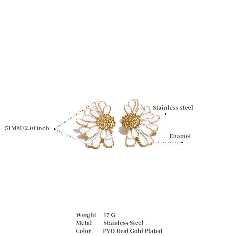 Floral Big White Black Enamel - Fashion Stud Earrings 18K Gold Color PVD Plated Stainless Steel Jewelry