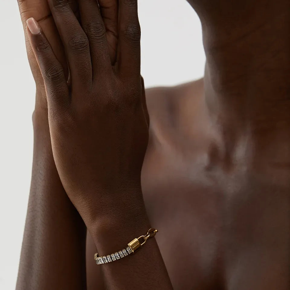 Elevate your look with this bling metal lock bracelet, designed with a sleek stainless steel base, adorned with shimmering cubic zirconia, and secured by a modern spring-ring clasp. Finished in PVD real gold plating, this waterproof luxury bracelet adds just the right touch of elegance and edge to your daily or evening ensemble.
