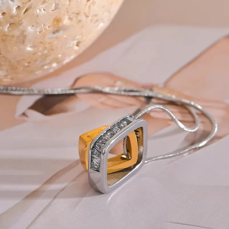 Showcase modern elegance with this double layered overlay pendant necklace, featuring a square hollow design and sparkling cubic zirconia accent. Crafted from durable 316L stainless steel and finished with PVD real gold plating, this piece is ideal for lovers of clean lines and contemporary fashion.