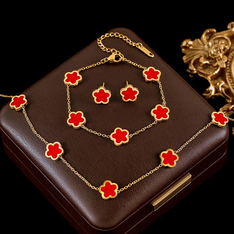 Five-Leaf Clover Jewelry Set – Pink Flower Stainless Steel Trio