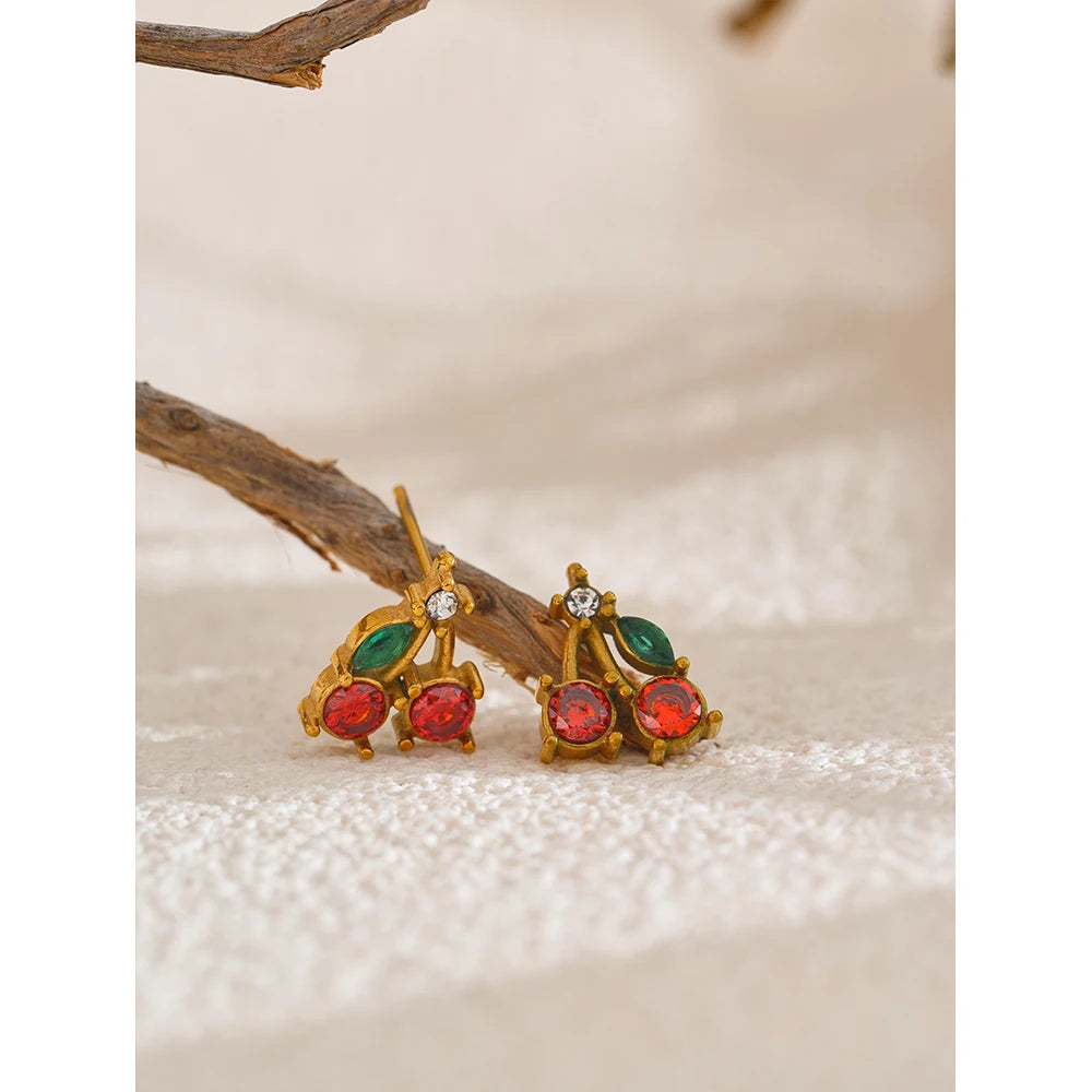 Red Cubic Zirconia Cherry Fruit Stud Earrings for Women Stainless Steel Waterproof Jewelry