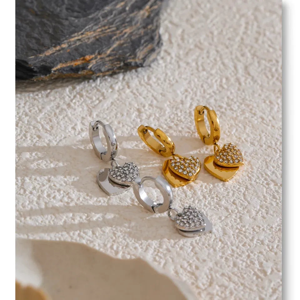 18K Gold Plated Stainless Steel Double Heart Cubic Zircon Drop Hoop Earrings for Women Hypoallergenic High Quality Jewelry