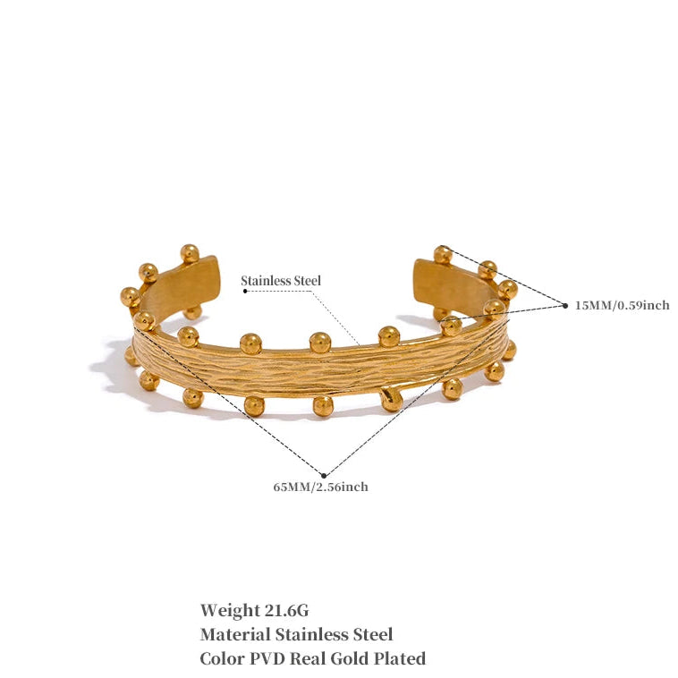 Make a bold fashion statement with this wide open cuff bracelet, crafted from high-quality stainless steel and finished in luxurious 18K PVD gold plating. Designed with a textured metal surface and sleek geometric shape, this French-inspired statement piece adds timeless elegance and contemporary edge to any look—perfect for both casual and upscale wear.